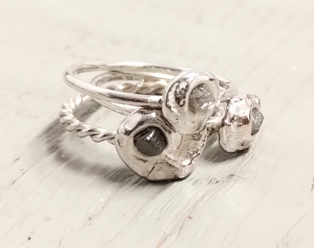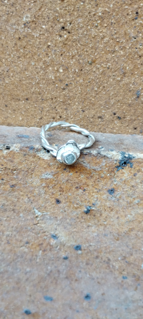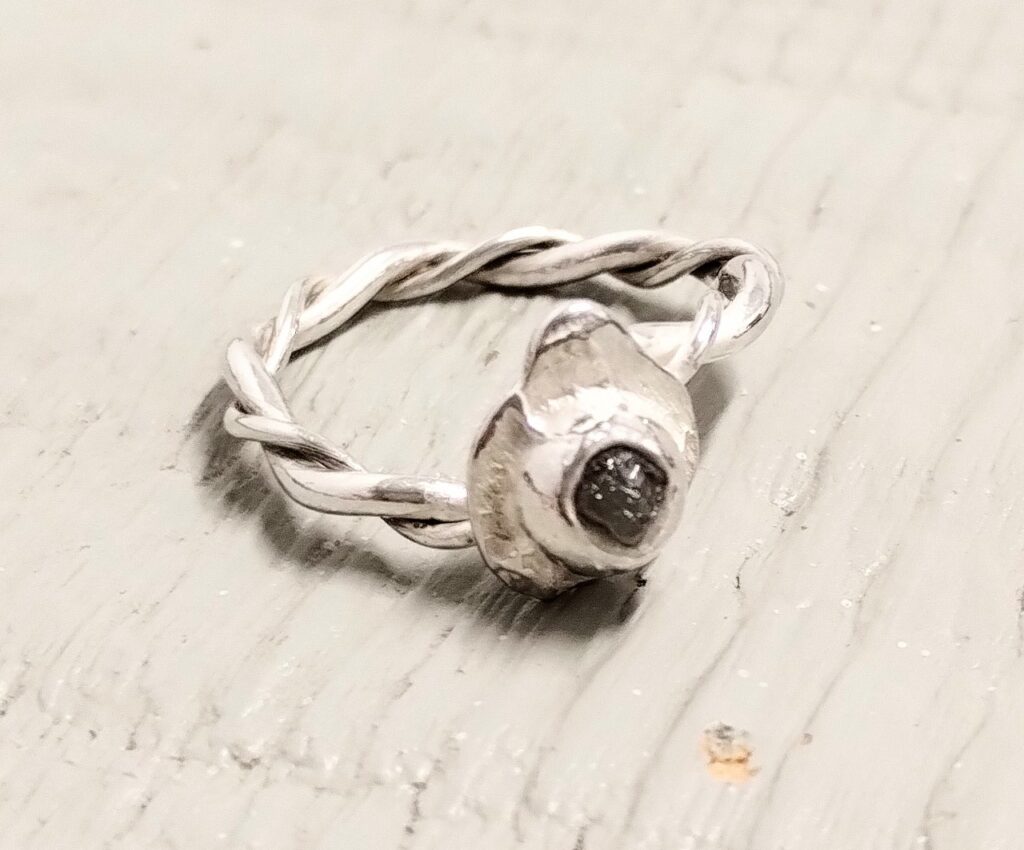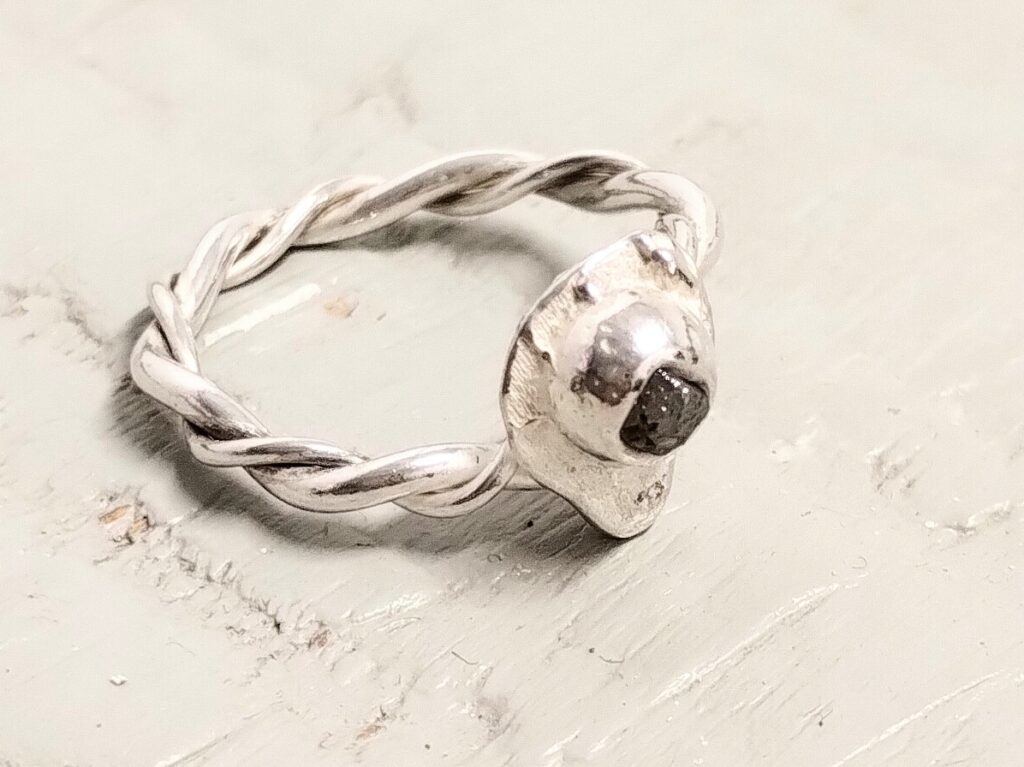 Anell apilable de plata amb diamant en brut encastat. Fils trenats. Talla 10 (equival a 50mm de perímetre interior)