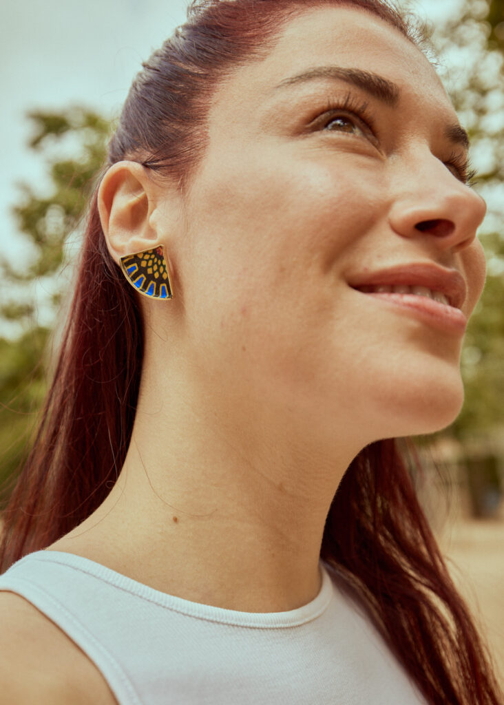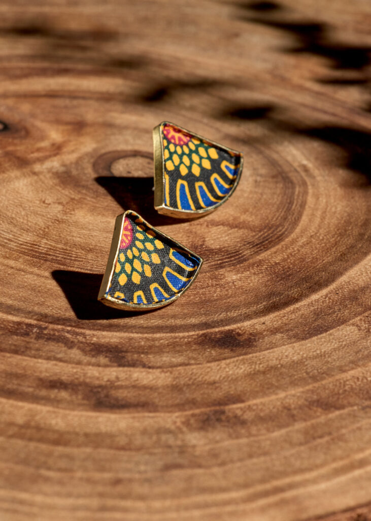 Pendientes de diseño contemporáneo artesanal, de latón reciclado en acabado dorado y tela wax (africana). Pendientes triangulares en acabado dorado latón pulido. Las telas africanas utilizadas son de material reciclado proveniente de retales, sobrantes de la producción de nuestra ropa.