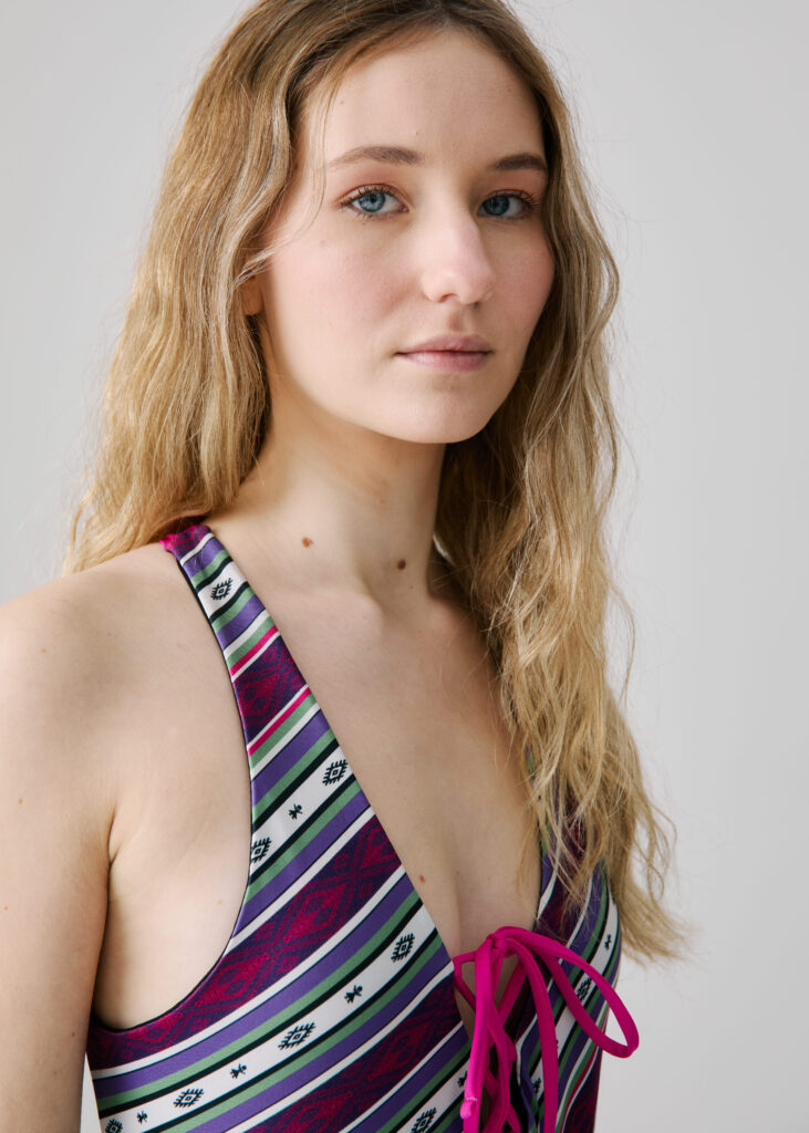 Inspirat en la paraula quítxua Munay, que significa amor. Aquest vestit de bany reversible d’una sola peça és el resum del confort i funcionalitat, en el seu disseny de cobertura integral que ofereix dues expressions estilístiques en un. El seu escot pronunciat i tirants amples creuats celebren la silueta femenina, oferint un ajust perfecte que s’adapta a l’energia dinàmica de la vida.