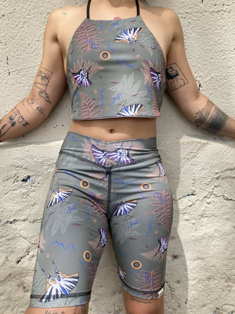 Aquest disseny es diu NONI, protagonitzat per la papallona zebrada, que és diürna i s’entreveu en molts paratges. El seu color ressona amb un món mamífer i a l’empempta present de qualsevol papallona, que abans va ser eruga. La perseverança, confiança i amor del seu vol em recorden a l’estimada Noni, que sovint em fa arribar captures de papallones, i la seva mirada és plena de vida.