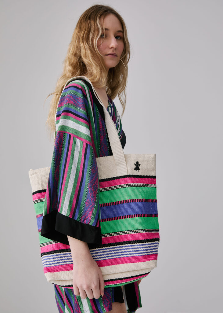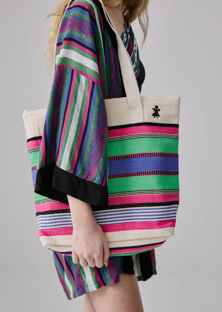 La tote bag Huari, feta a mà amb la tècnica ancestral “teler en pinta”, filat amb amor per dones indígenes bolivianes del poble/ètnia chiquitano, de l'associació “La Pauroca”, situades a San José de Chiquitos (Amazònia boliviana).