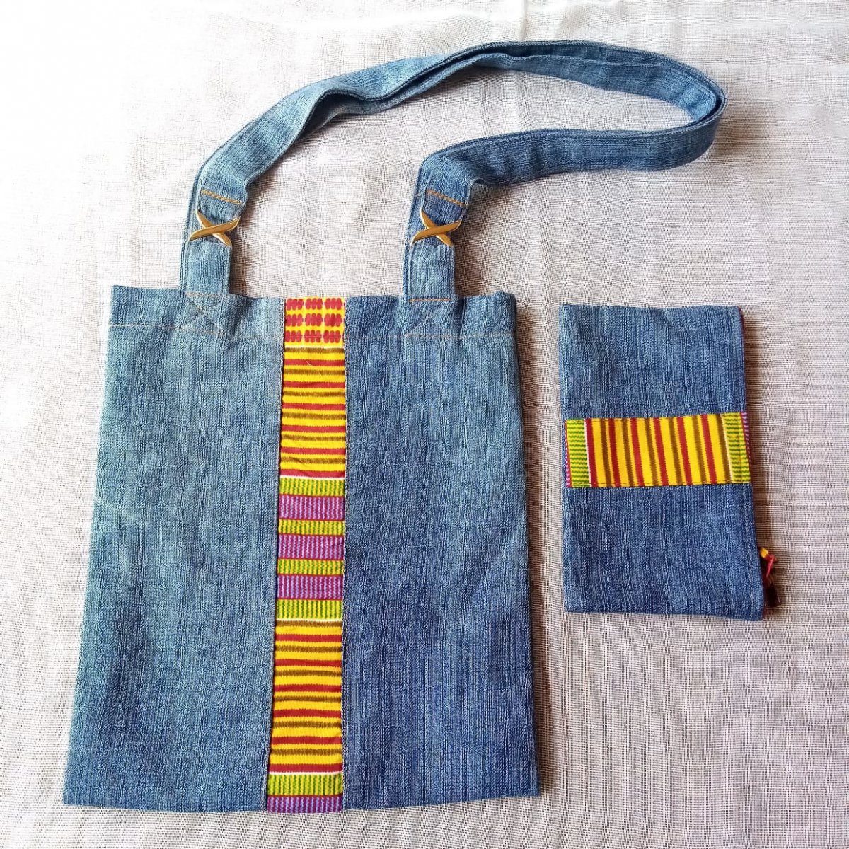 Bossa amb butxaca interior elaborada amb teixit texà reaprofitat a la campanya TEXANS PEL CLIMA combinat amb tel.la wax africana. Tamany: 25 cm x 28 cm, nances de 35 cm d’alçada; Estoig amb els mateixos teixits. Tamany: 19cm x 11cm.