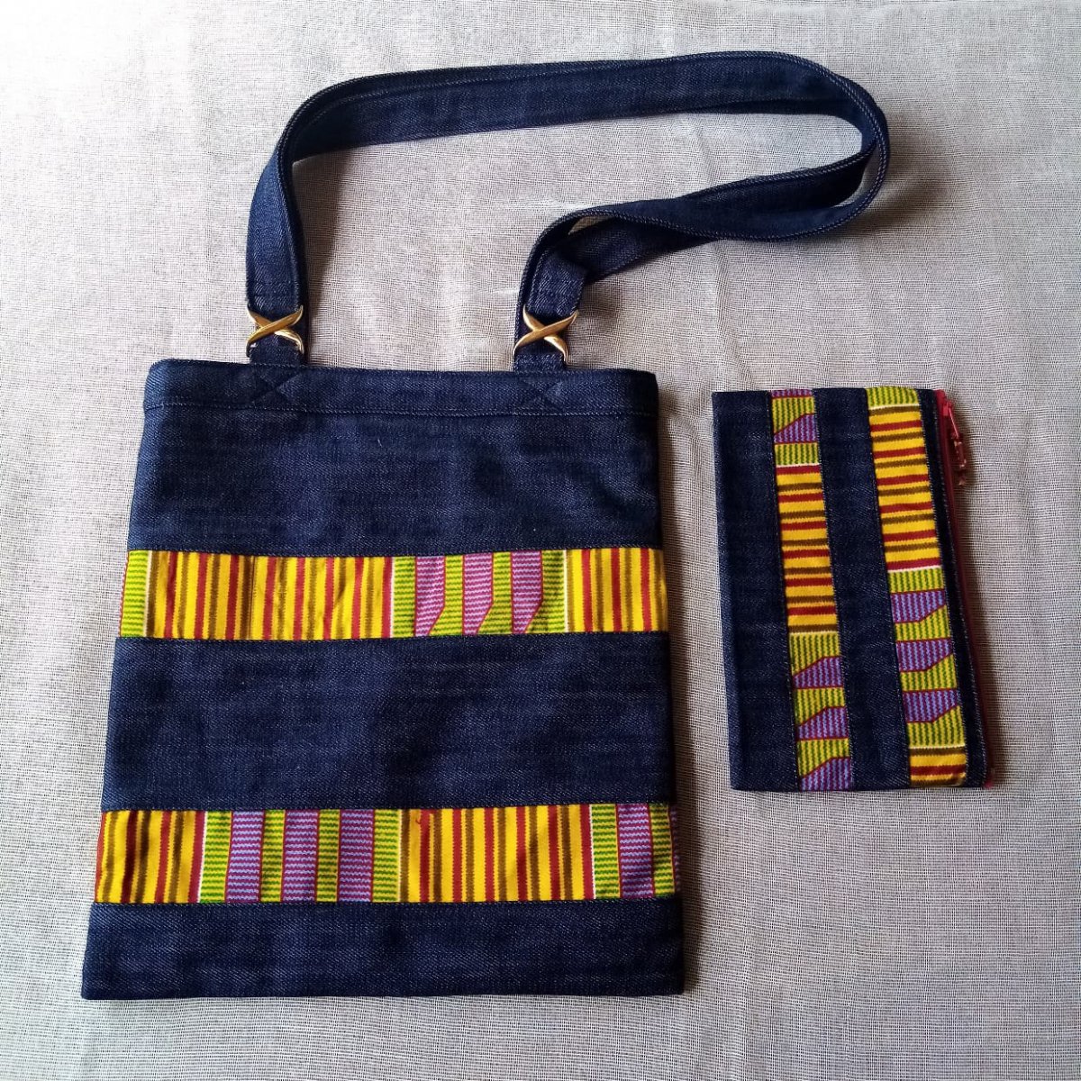 Bossa amb butxaca interior elaborada amb teixit texà reaprofitat a la campanya TEXANS PEL CLIMA combinat amb tel.la wax africana. Tamany: 25 cm x 28 cm, nances de 35 cm d’alçada; Estoig amb els mateixos teixits. Tamany: 19cm x 11cm.