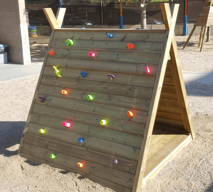 El somni de qualsevol infant! La cabana és una preciosa estructura pensada com amagatall on refugiar-se i com a element d’escalada. Per un costat tenim les presses i per l’altre les cordes. Els infants imaginaran que és la seva caseta on descansar, jugar, compartir…, i si escalen les parets fins dalt, es convertiran en genets, pirates buscant illes i inclús imaginar que es troben dalt de tot de la Pica d’Estats!