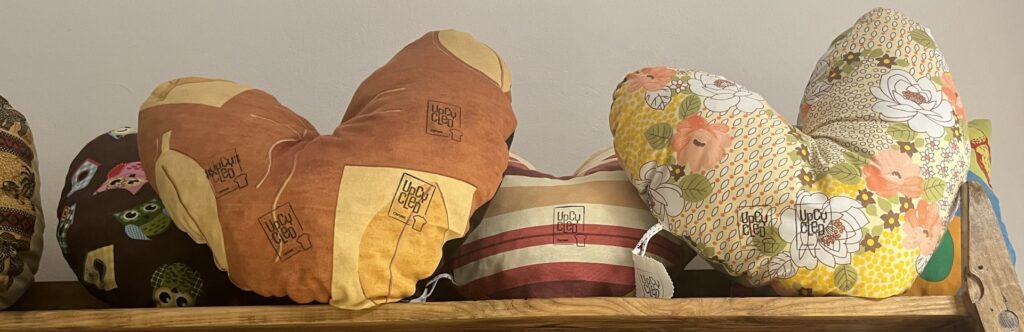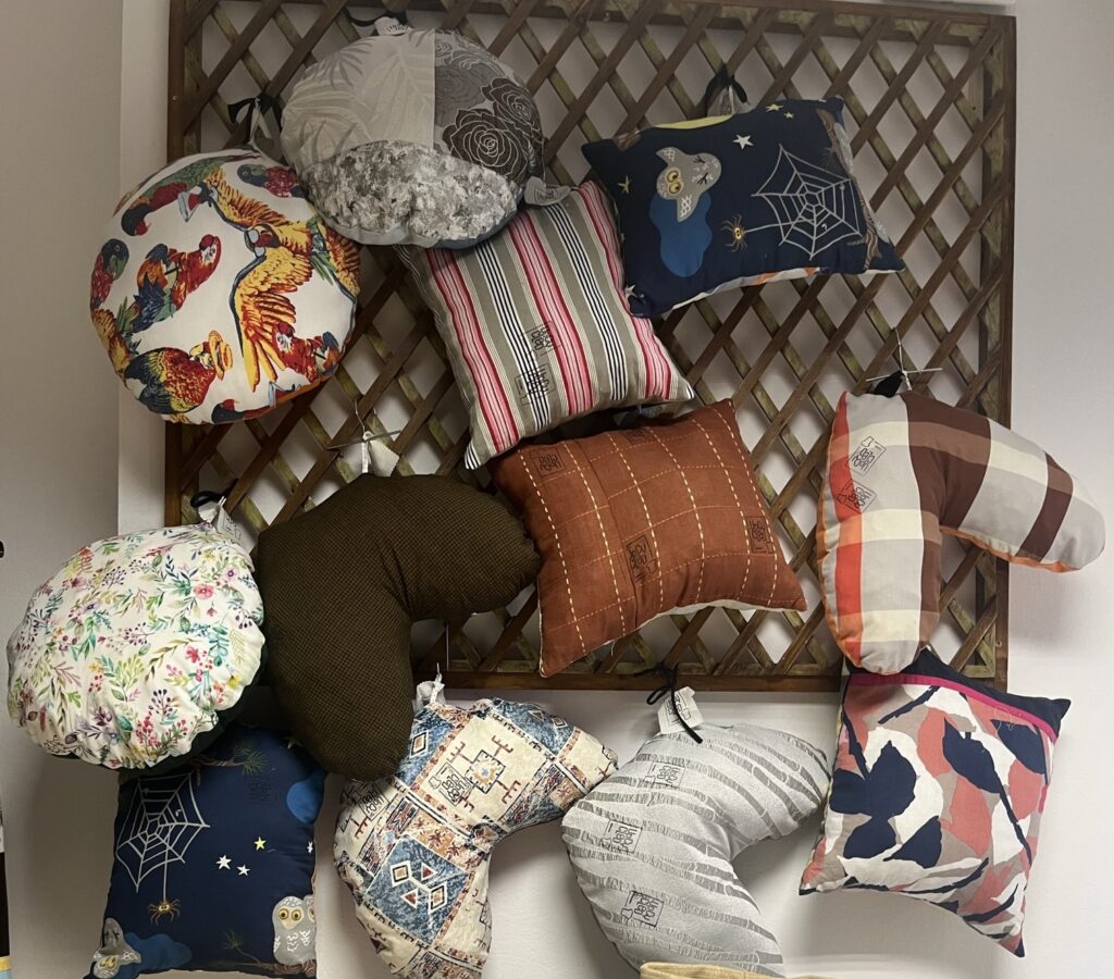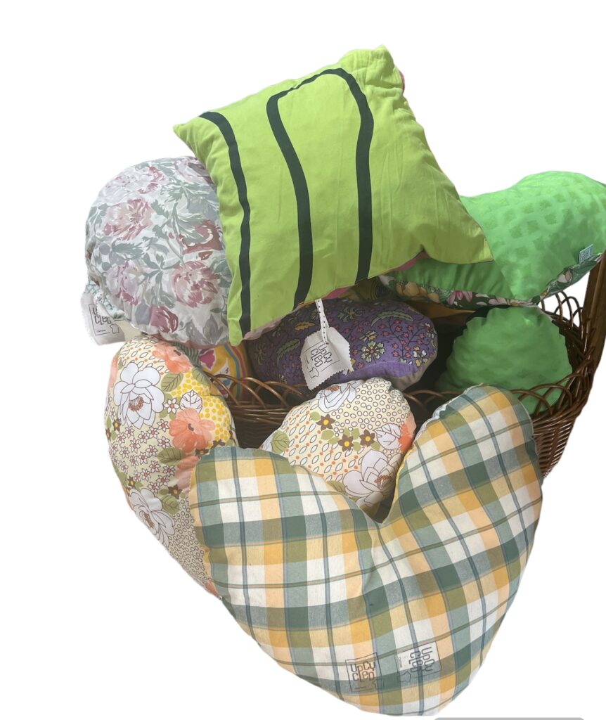 Coixins decoratius, per nosaltres  “SIT CUL’s”,  de tela 100% reutilitzada i farcit també extret de residu voluminós. És portable, agradable al tacte i el pots rentar.  En podeu trobar de diferents formes, tamanys i estampats