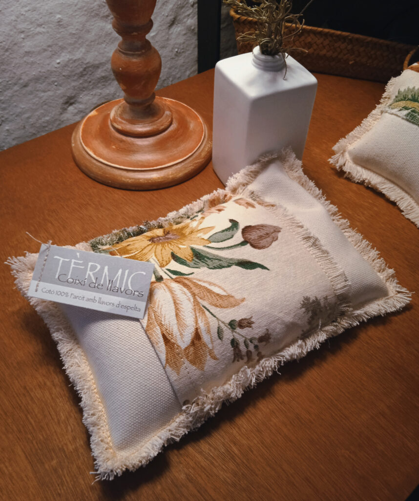 Coixí tèrmic farcit amb llavors d’espelta. Confeccionat amb loneta de cotó.