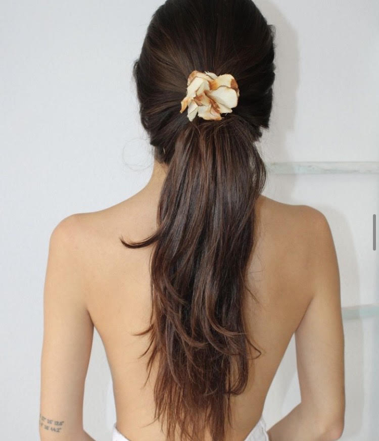 Goma de cabell ‘Menorca’, inspirada en aquesta illa d’aigua cristal·lina de les Illes Balears. Està feta amb cotó i lli, dissenyada amb pigments naturals i té forma de pètals de flor.