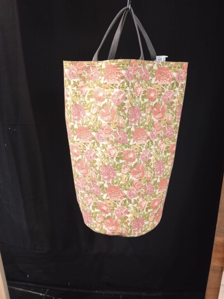 Contenidor de tela 100% reutilitzada, fet a partir de residu tèxtil, restes de tendals pel folre interior i tires de pell per les nanses.