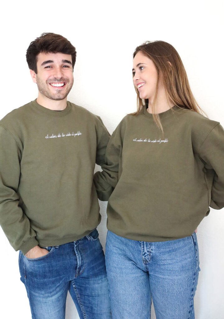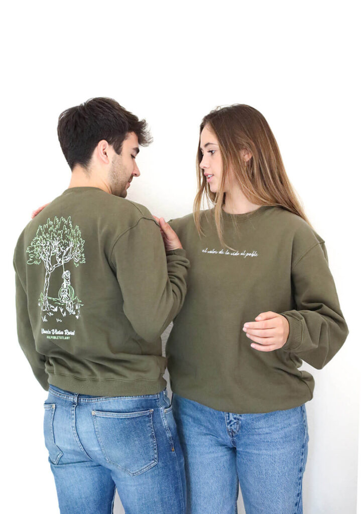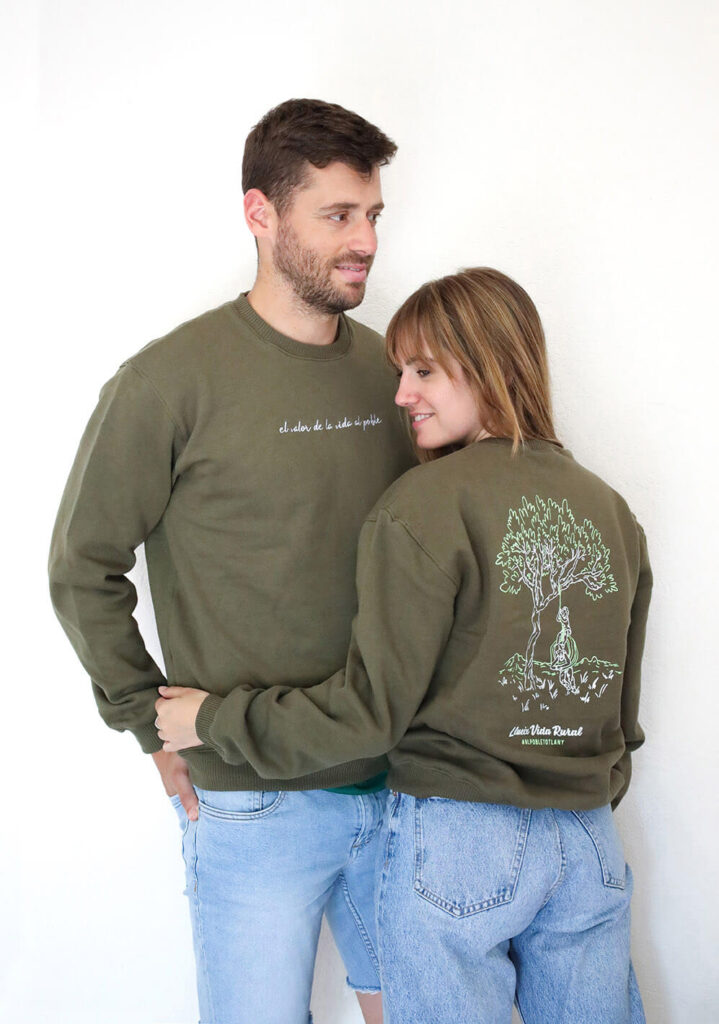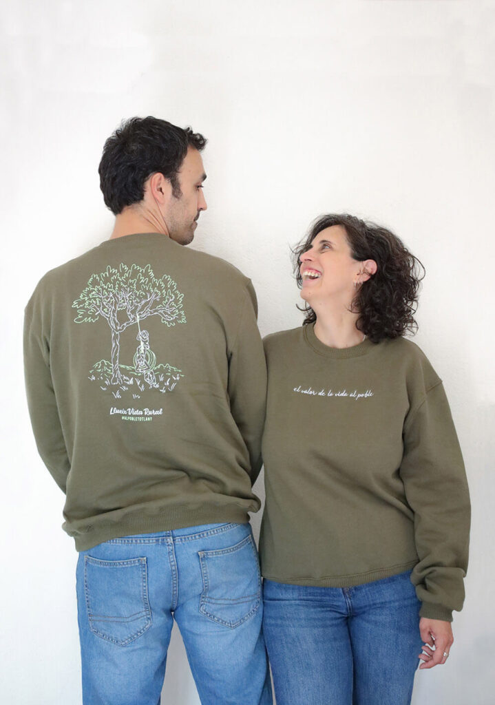 Dessuadora amb el lema del projecte “El valor de la vida al poble” brodat al pit i il·lustració de Lara Costafreda serigrafiada a l’esquena, que representa un dels valors de la vida al poble: el vincle amb la natura des de la infància. Roba 100% cotó, de producció integrada, que garanteix l’ús de productes químics no tòxics per la pell ni el planeta. Gramatge del teixit: 280 grs/m2.