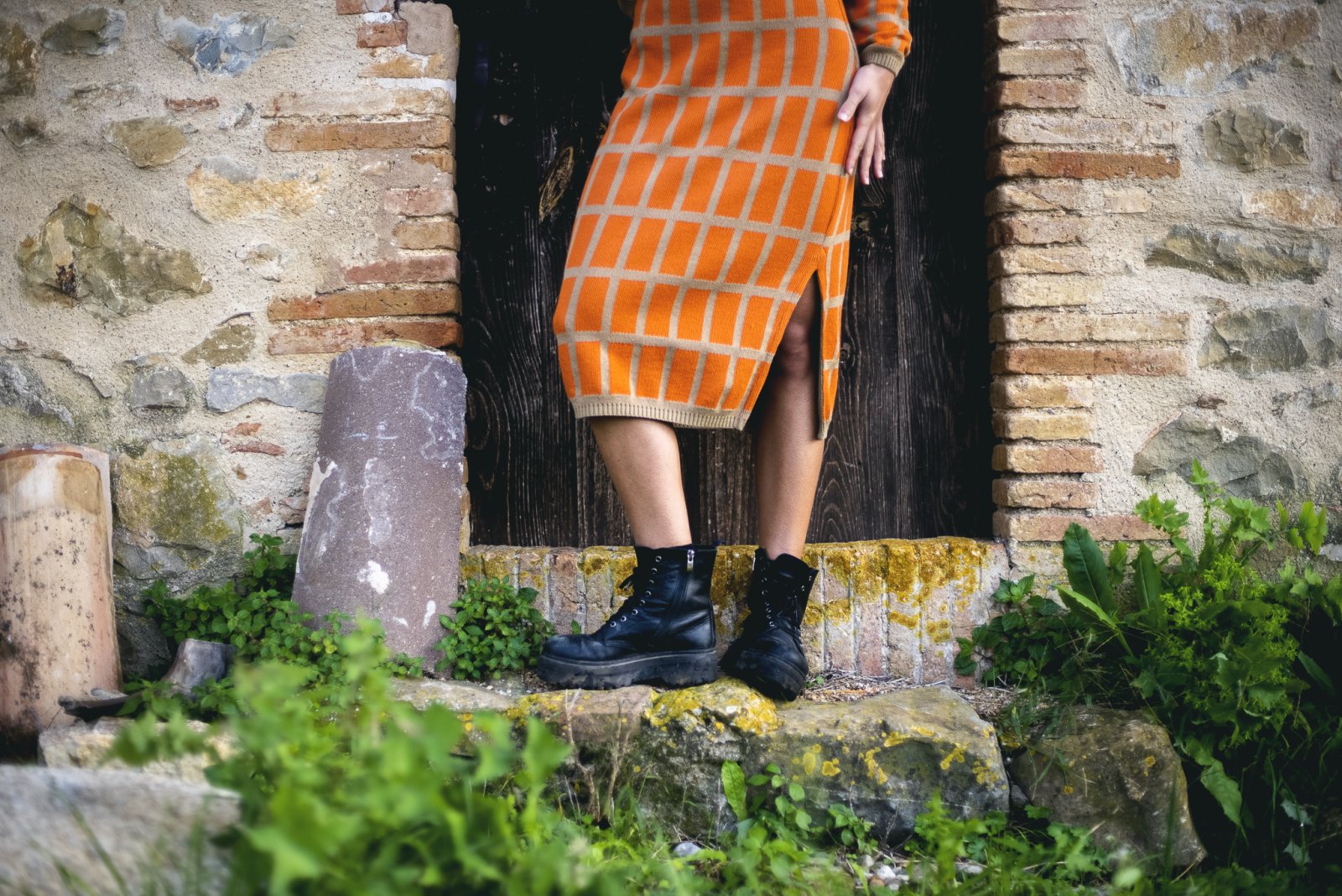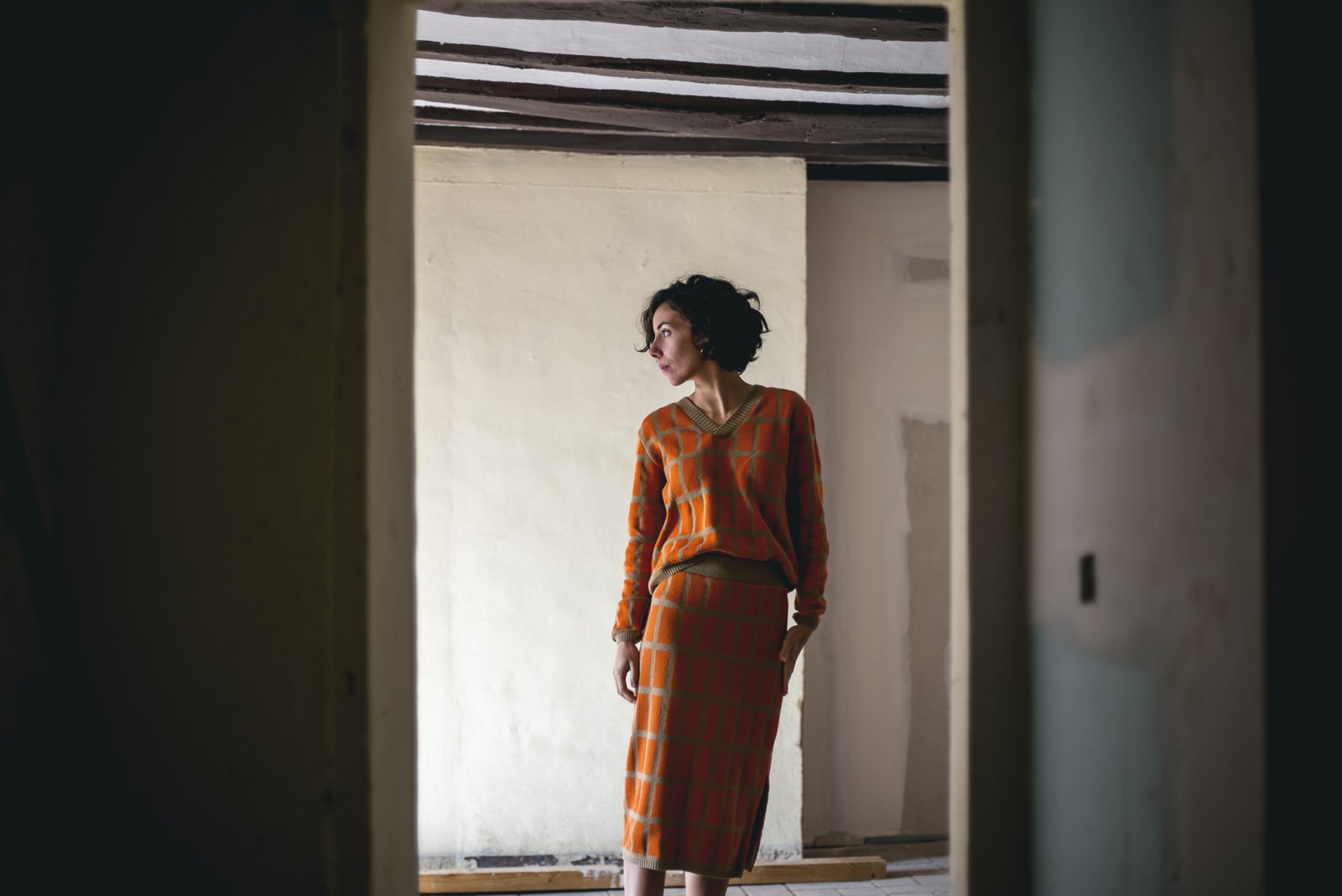 Faldilla 100% cotó pentinat -tacte molt suau- de punt jacquard en beig i taronja. Té una obertura al lateral. A la cintura hi ha una goma de 5 cm.