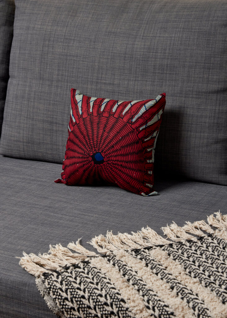 Cojín pequeño decorativo, de tela de algodón (wax 100%) estampado con relleno incluído.