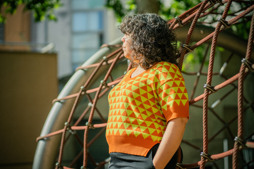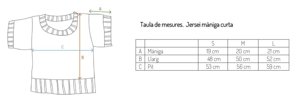 Jersei 100% cotó, teixit amb dos fils, galga 10. El cos i les màniges combinen triangles de color taronges i verd festuc. El cos és curt, amb un baix acabat amb canalè ample i amb talls als dos laterals. De màniga curta i escot rodó.