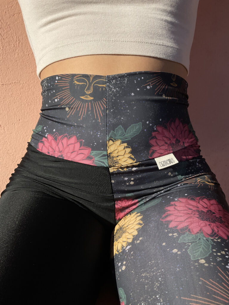 Leggin llarg de cintura alta a turmell, amb una cama estampada i l’altre negre llisa. La cintura del leggin queda per sobre el melic, cuidant les teves lumbars i la zona abdominal.