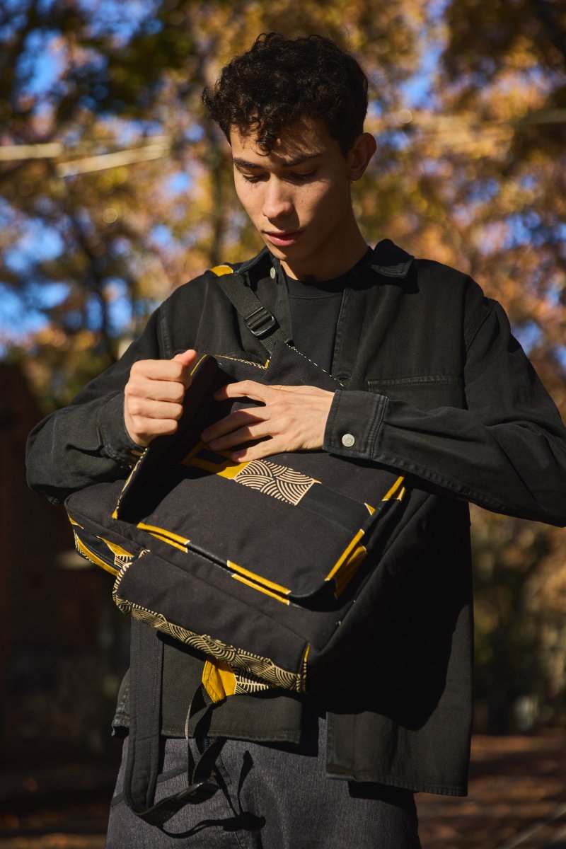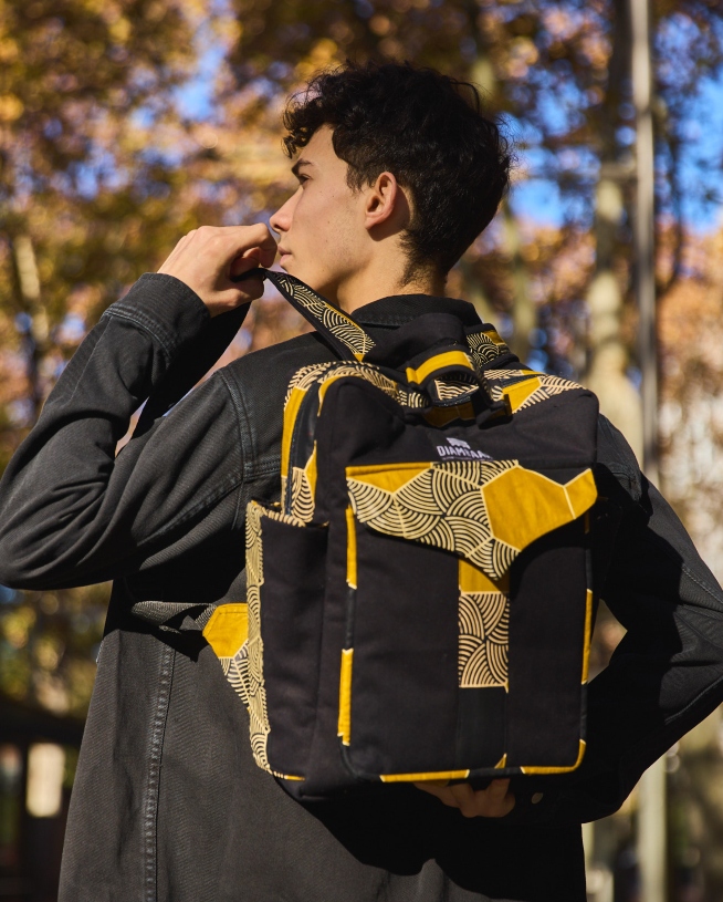 Motxilla amb fragment de tela wax multiús, amb compartiments múltiples i cremallera. Nanses graduables.