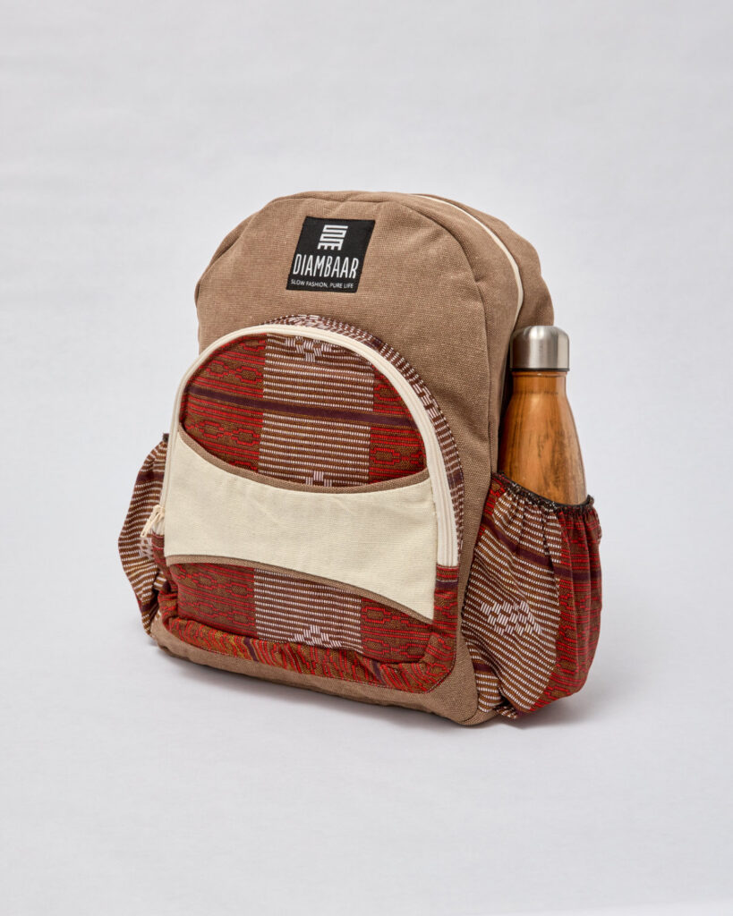 Mochila loneta combinada con compartimiento múltiple y cremallera con fragmentos de tela wax. En la parte frontal dispone de un bolsillo con cierre de cremallera y con compartimiento en los laterales. Asa de mano y dos asas de hombro ajustables y acolchadas.