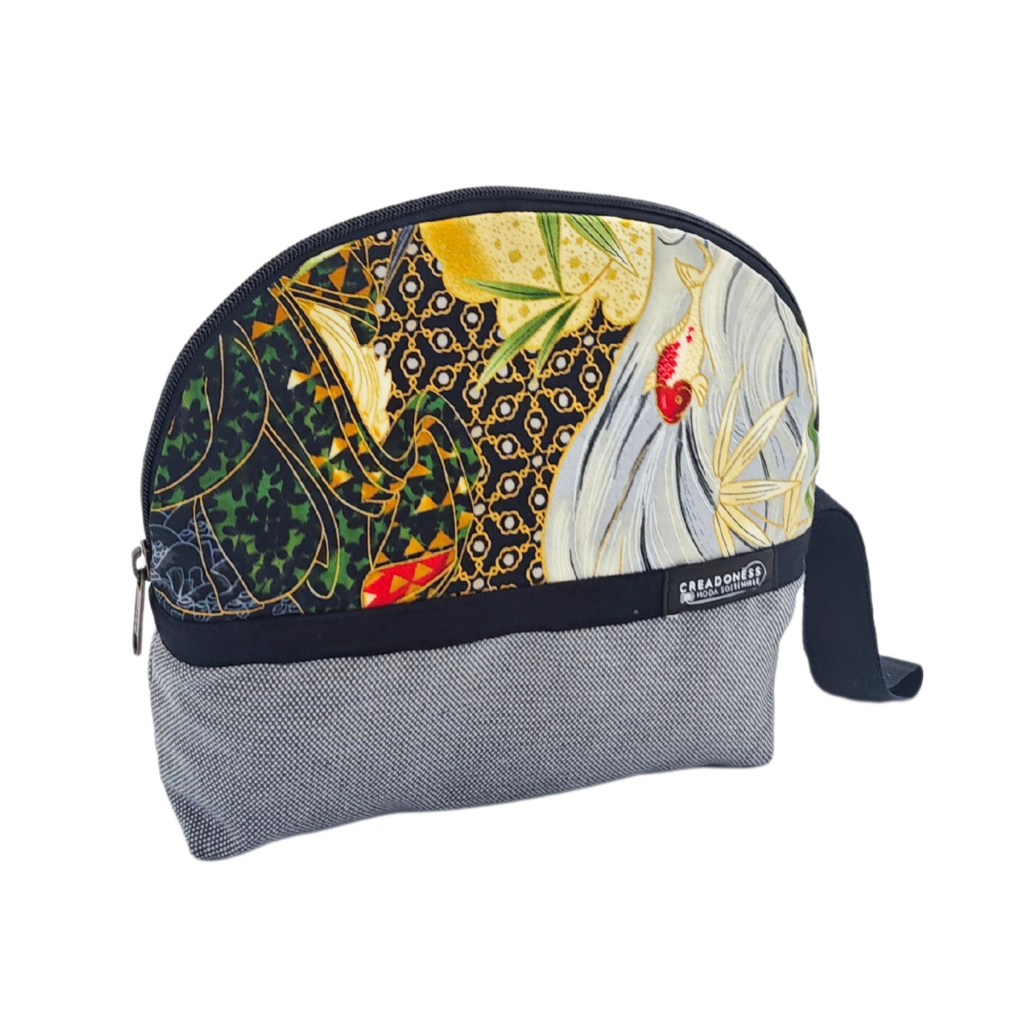 Material: Aquest necesser gran està fet a mà per les dones que formem en el Programa Social de Creadoness. Està confeccionat amb una suau loneta de cotó bicolor, amb la característica de ser antimanjades. A l'interior està forrat amb popelín negre.