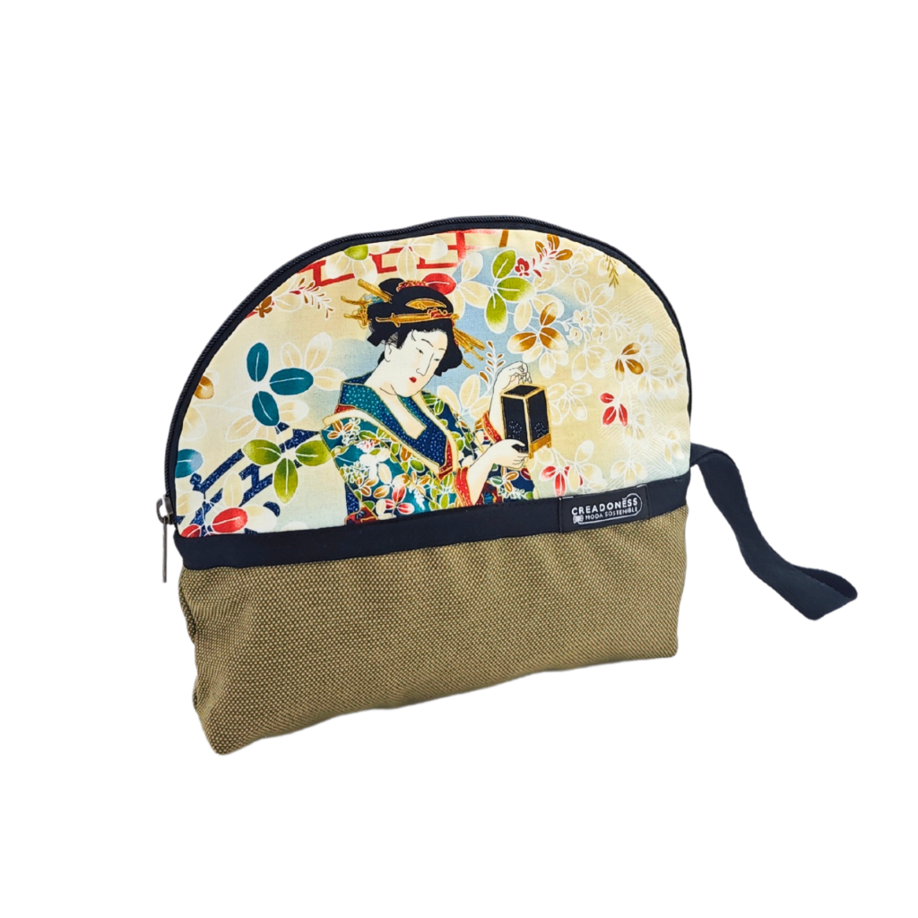 Material: Aquest necesser gran està fet a mà per les dones que formem en el Programa Social de Creadoness. Està confeccionat amb una suau loneta de cotó bicolor, amb la característica de ser antimanjades. A l'interior està forrat amb popelín negre.