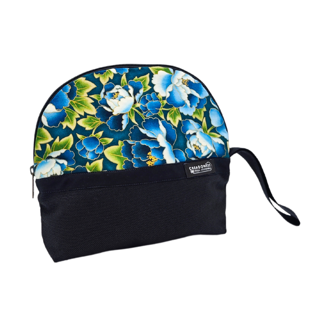 Material: Aquest necesser gran està fet a mà per les dones que formem en el Programa Social de Creadoness. Està confeccionat amb una suau loneta de cotó bicolor, amb la característica de ser antimanjades. A l'interior està forrat amb popelín negre.