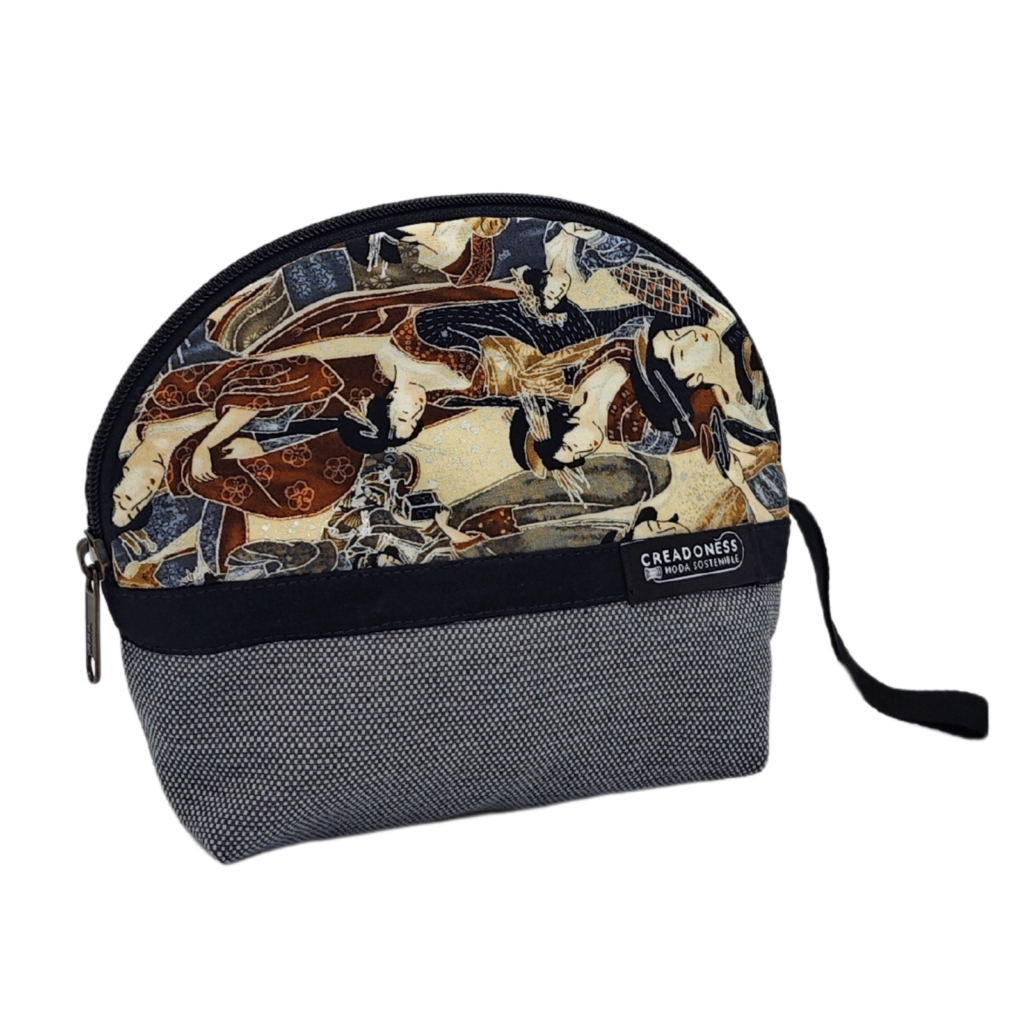 Material: Aquest necesser petit està fet a mà per les dones que formem en el Programa Social de Creadoness. Està confeccionat amb una suau loneta de cotó bicolor, amb la característica de ser antimanchas. A l'interior està forrat amb popelí negre.