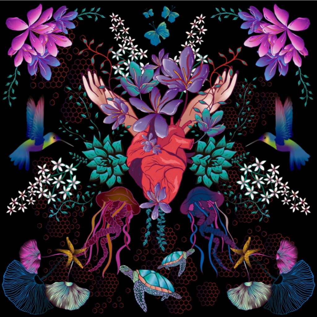 La narrativa d'aquest disseny és la metàfora figurativa de CREADONESS. És un homenatge a l'energia creativa de les dones i al cultiu dels seus dons manuals com a artifici de vida. Rodejada d'una natura subversiva, integra la botànica mediterrània de la flor del safrà i els ametllers, amb les ruscs: representació de l'ecosistema liderat per dones, que treballen en equip pel bé comú. Les tortugues amphibis ancoren els seus significats en l'adaptabilitat als diferents medis i el seu pas lent ens representa el mode de producció Slow Fashion. Mentrestant, les papallones i els colibrís sucumbeixen en el concepte de la metamorfosi i la resiliència.