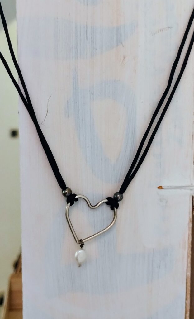 penjoll silueta cor i boles de plata envellida de plata amb perla cultivada penjant del cor. Fil de seda sintètic cordat amb nusos de macramé.