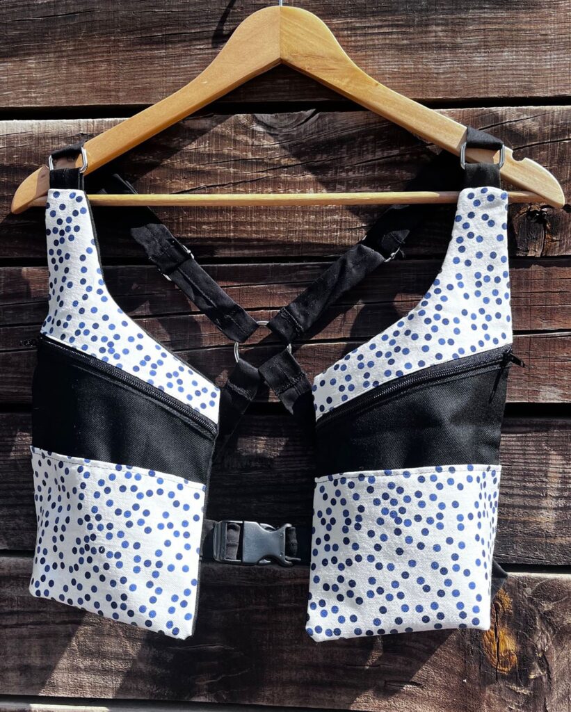Pistolera amb talps en diferents blaus i fons negre. Cremallera i tirants en negre