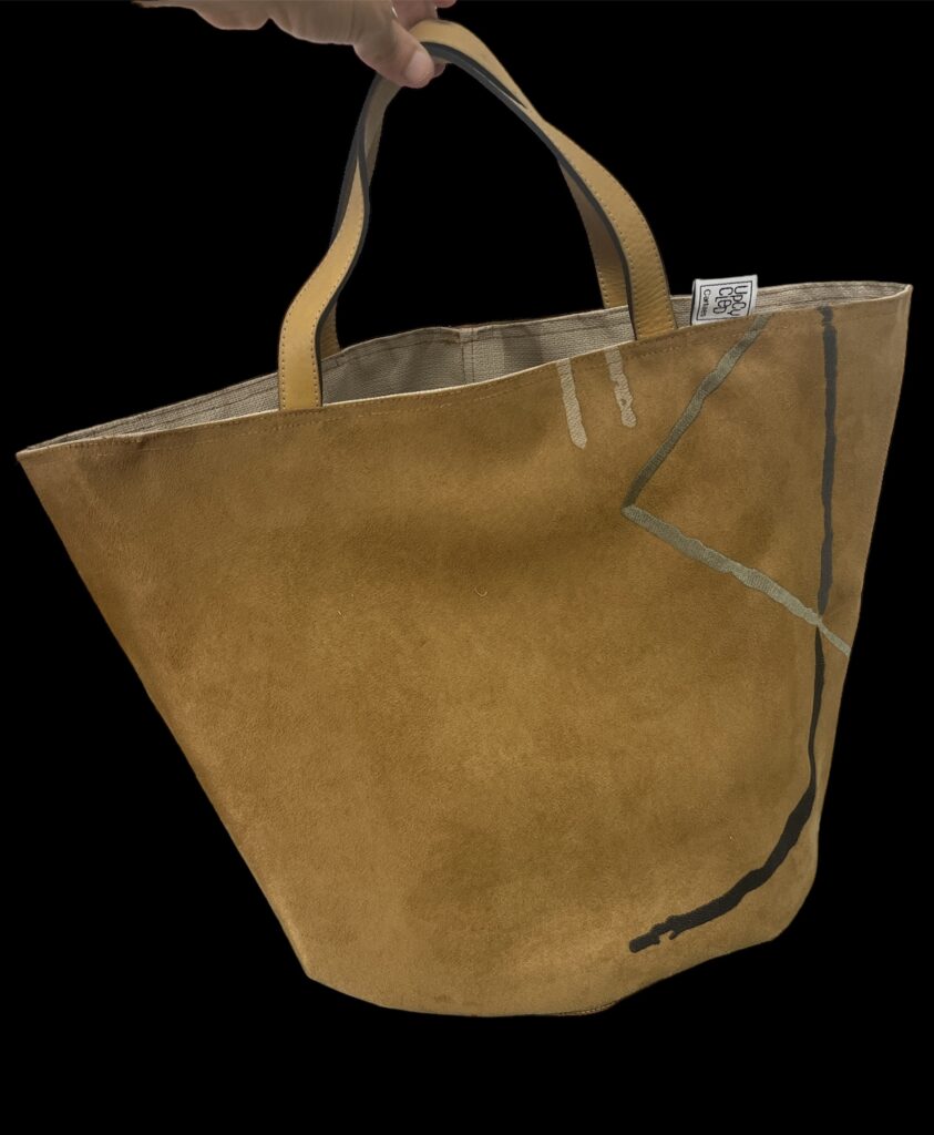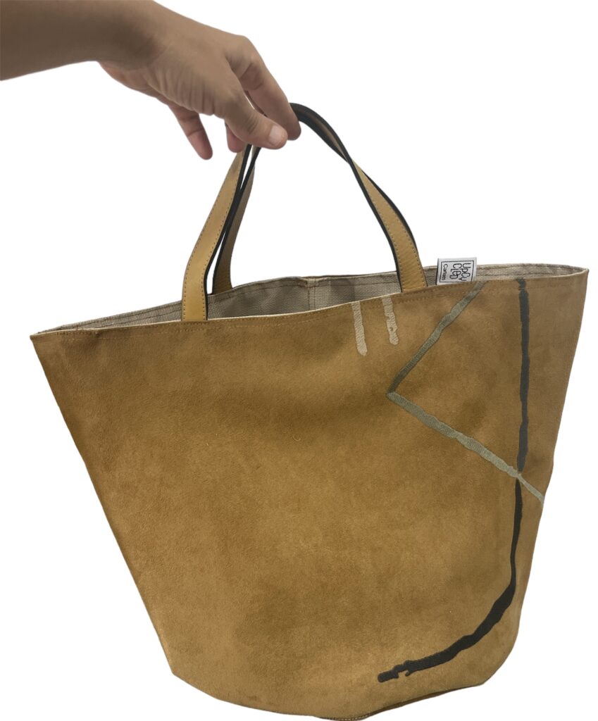 Senalla de tela 100% reutilitzada, feta a partir de residu tèxtil d’ante i restes de tendals pel folre interior i tires de pell per les nanses.