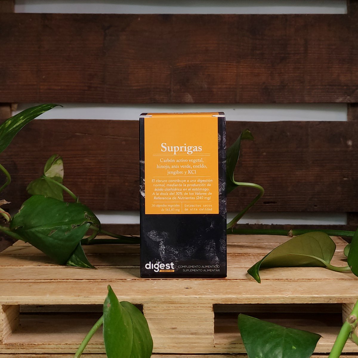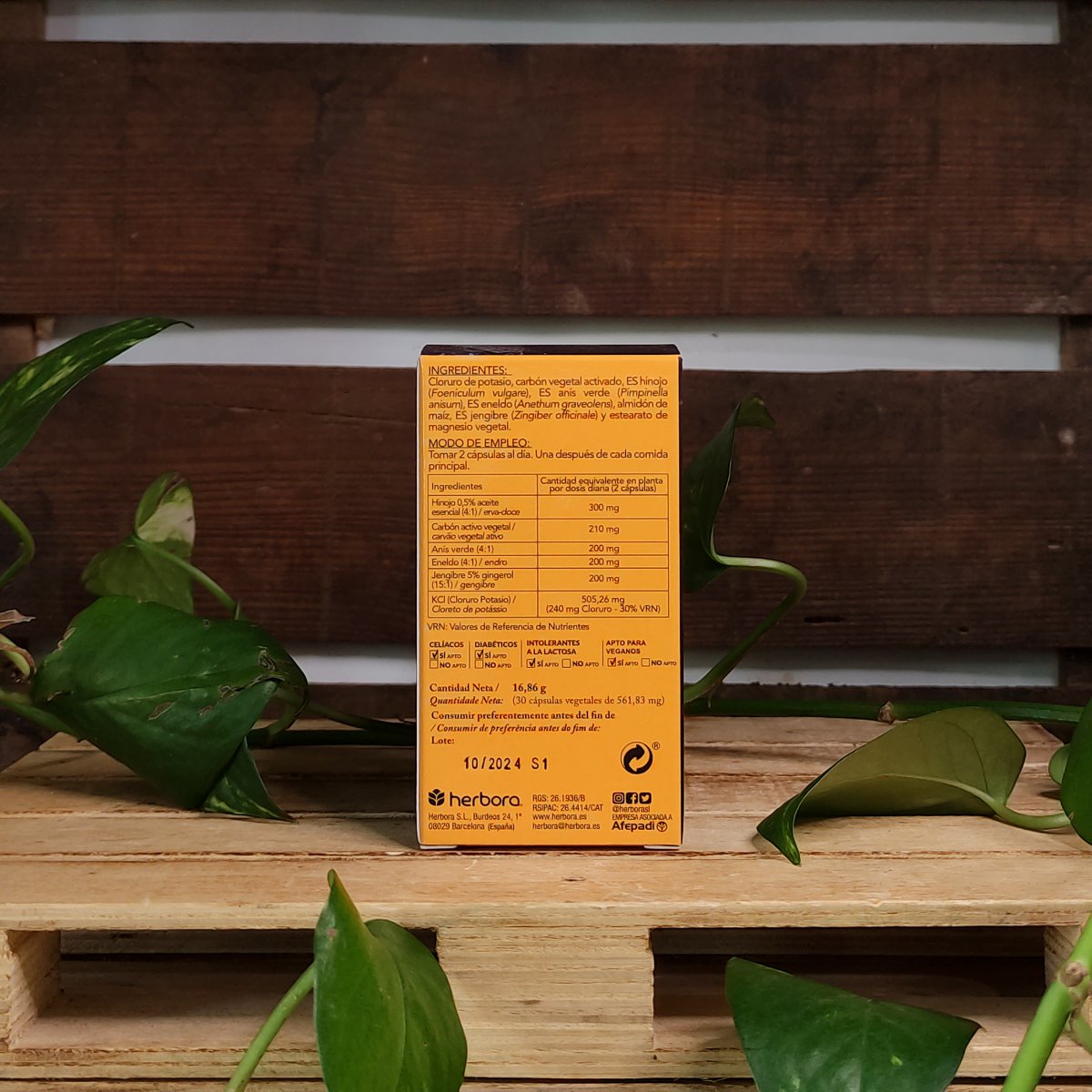 Produeix àcid clorhídric a l'estómac, regulant l'activitat digestiva. Amb Fonoll, Anís verd, Anet, Gingebre, KCI i Carbó actiu