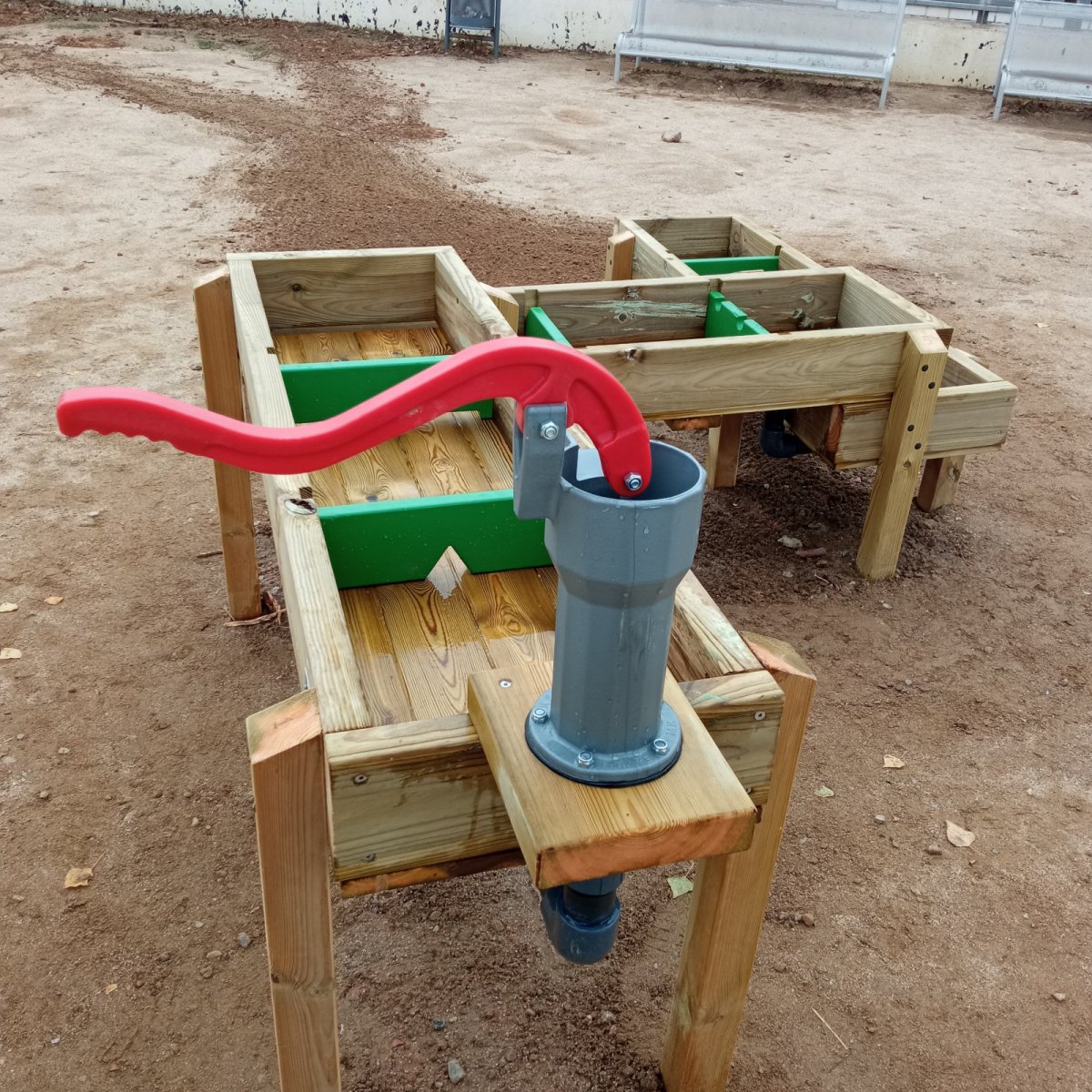 Una taula amb tres nivells d’alçades diferents que pot omplir-se d’aigua, sorra i molta imaginació! Inclou una bomba d’aigua per on farem arribar aquest meravellós element i amb el que podrem realitzar tota mena de jocs d’experimentació i manipulació. L’aigua queda recollida en un recipient i recircula per a tornar de nou a la bomba. S’hi pot jugar dret i disposa d’una bona llargada perquè hi juguin més de dos infants per nivell. A més, a cada nivell disposem d’unes plaquetes amb forats de diferents formes geomètriques perquè hi passi l’aigua per dins. Aquestes plaquetes les podem treure amb facilitat i posar en qualsevol dels altres nivells. És una taula robusta, feta de fusta i tractada especialment per resistir anys a la intempèrie.