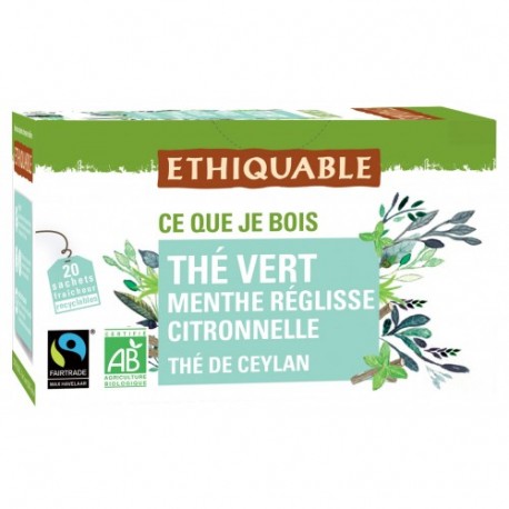 Te verd amb menta, regalèssia i citronel·la en bossetes BIO 36 g. De Comerç Just i Agricultura Ecològica. Sense aromes afegides.