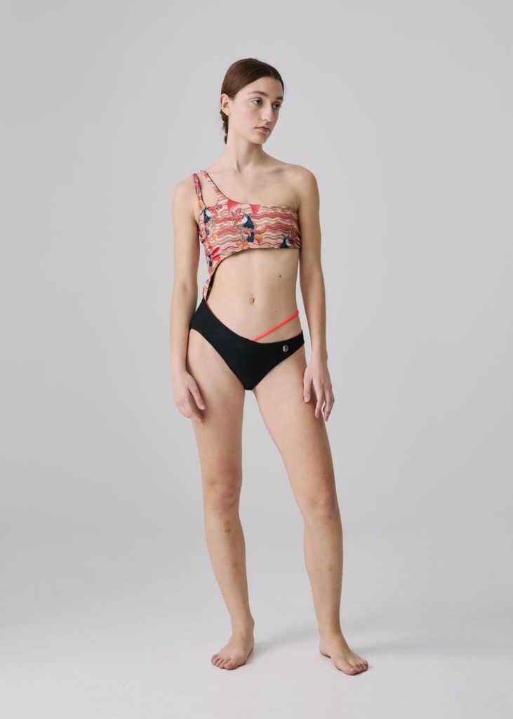 El Trikini Sutó Reversible porta en les seves línies la fluïdesa del riu Sutó, testimoni i naixement de la cultura Chiquitana, sent un tribut a la vitalitat que l’aigua aporta a la vida i als ecosistemes. Capturem les arts originals fetes per les artesanes que exhibeix la flora i fauna d’aquesta regió, en la tonalitat del barroc chiquitano, dels seus ancestres.