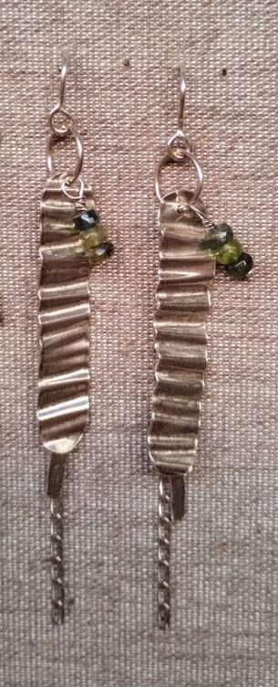 arracades plata ganxo amb cadena, fil, planxa ondulada i turmalines verdes