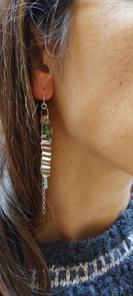 arracades plata de ganxo amb cadena i fil, planxa ondulada i turmalines verdes.