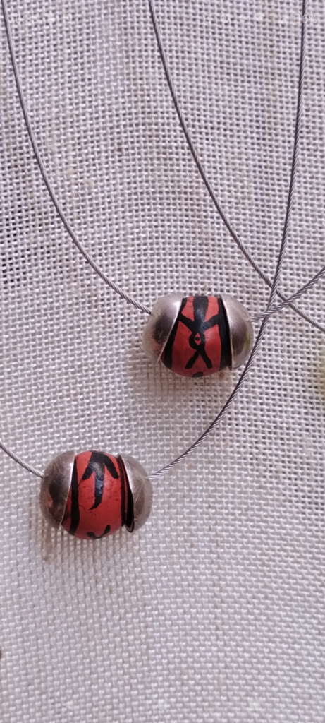 Penjoll amb bola de fang pintada i topes i tanca de plata, el fil és un cable d'acer de 40cm i 0,9mm de gruix.