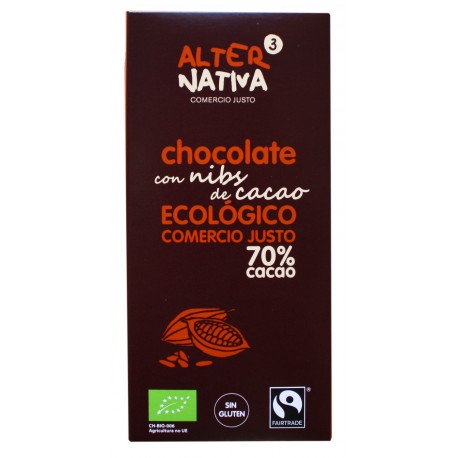 Xocolata 70% amb nibs de cacau. Els nibs de cacau aporten un sabor agredolç, profund i intens, i una textura sorprenent.