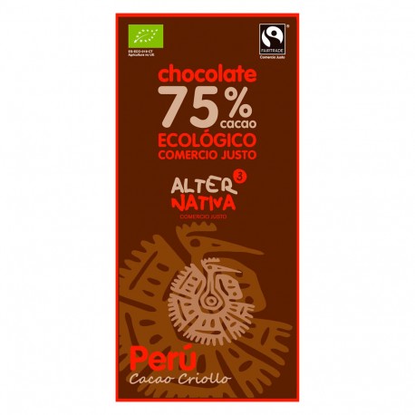 Xocolata negra 75% Perú. Elaborada amb cacau Crioll, varietat poc comuna i molt benvolguda.