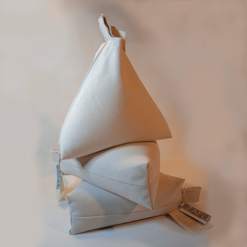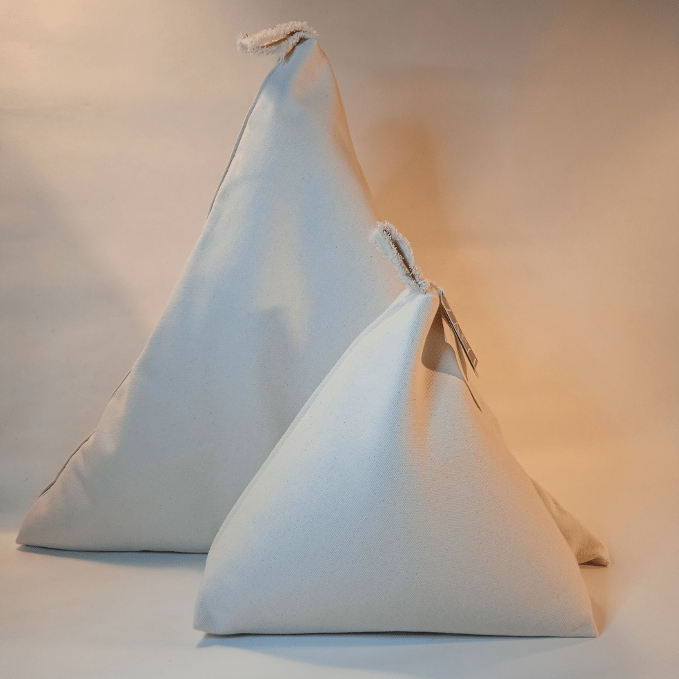El disseny triangular facilita la col·locació de les cames. L'alçada es pot adaptar buidant el coixí, en un dels costats té forma d'embut per omplir i buidar la pellofa de fajol fàcilment.